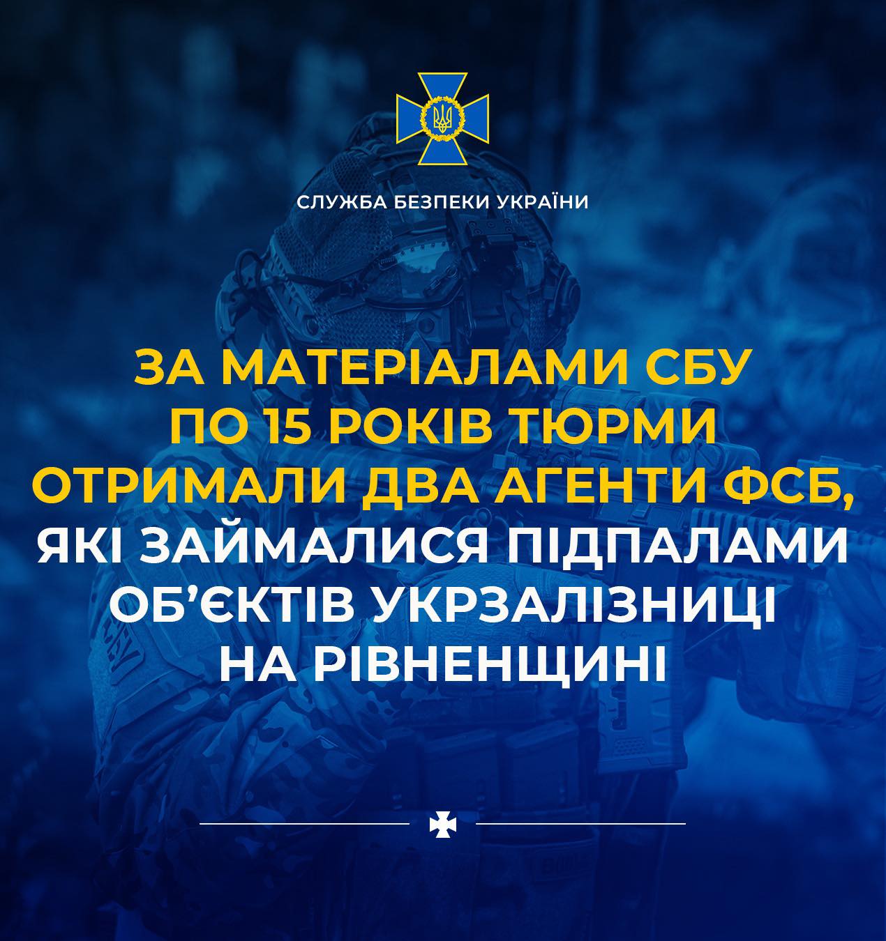 За матеріалами СБУ по 15 років тюрми отримали два агенти фсб, які займалися підпалами об’єктів Укрзалізниці на Рівненщині