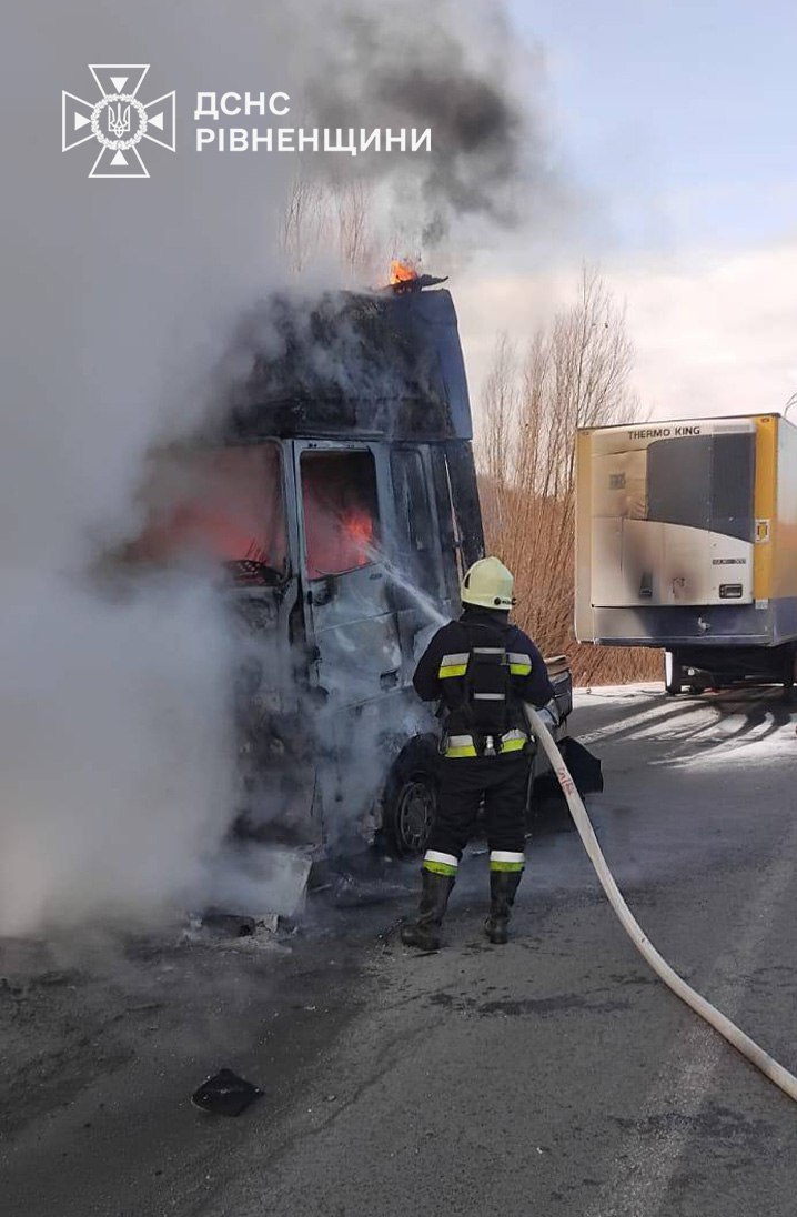 Рятувальники 16-ї державної пожежно-рятувальної частини селища Гоща оперативно прибули на місце події та вже о 10:03 локалізували пожежу. Вогонь знищив кабіну та двигун вантажівки, втім ніхто не постраждав.